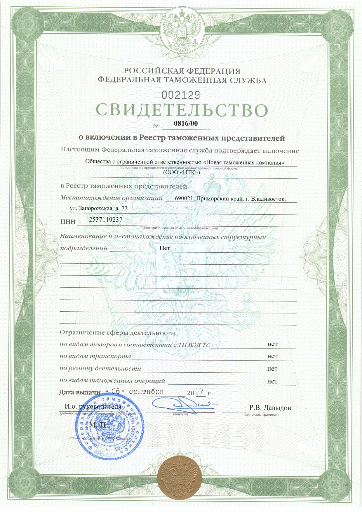 В компании работают опытные и высококвалифицированные, аттестованные специалисты в области таможенного дела.ООО «Новая таможенная компания» (ООО «НТК») - лицензированный таможенный представитель (свидетельство № 0816/00 от 06.09.2017 г.).