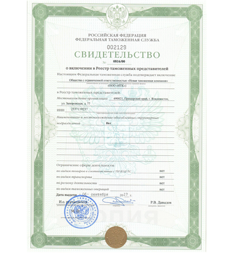 В компании работают опытные и высококвалифицированные, аттестованные специалисты в области таможенного дела.ООО «Новая таможенная компания» (ООО «НТК») - лицензированный таможенный представитель (свидетельство № 0816/00 от 06.09.2017 г.).
